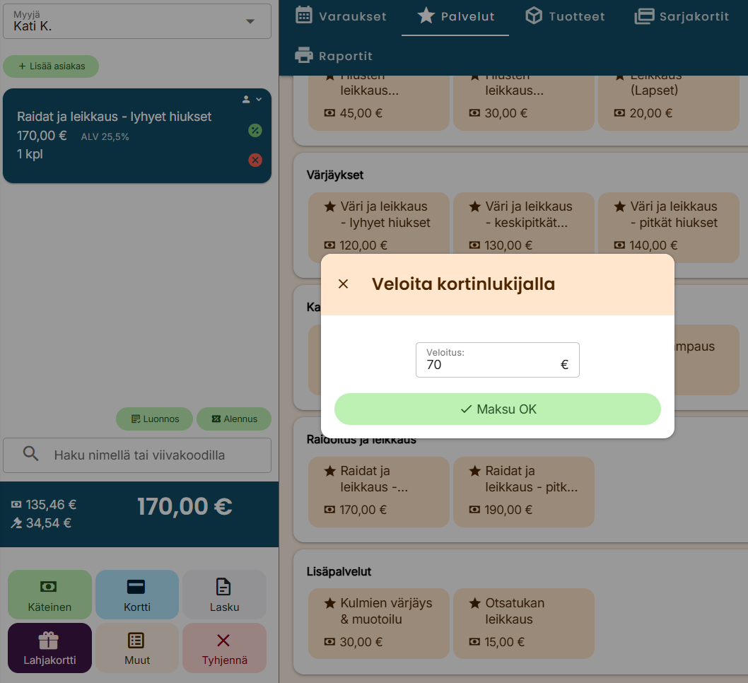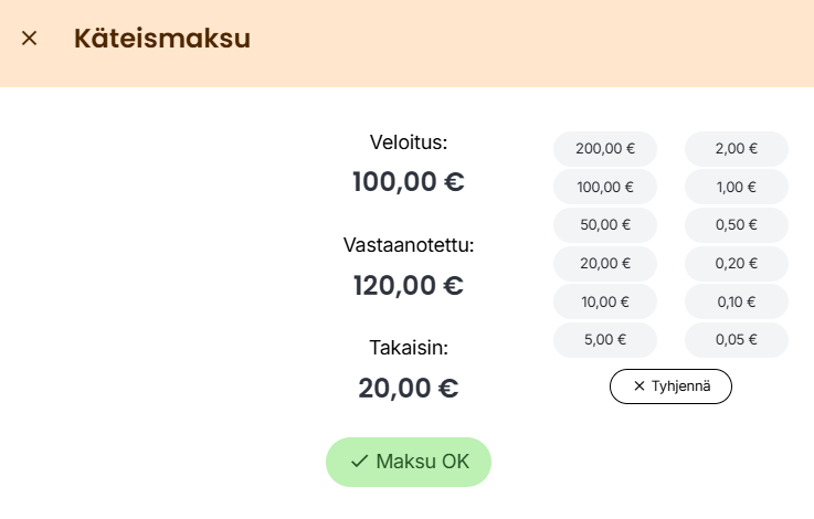 - Ota käteismaksu vastaan normaalisti ja valitse Maksu OK, minkä jälkeen kuitti tulostuu normaalisti listaten kaikki käytetyt maksutavat.